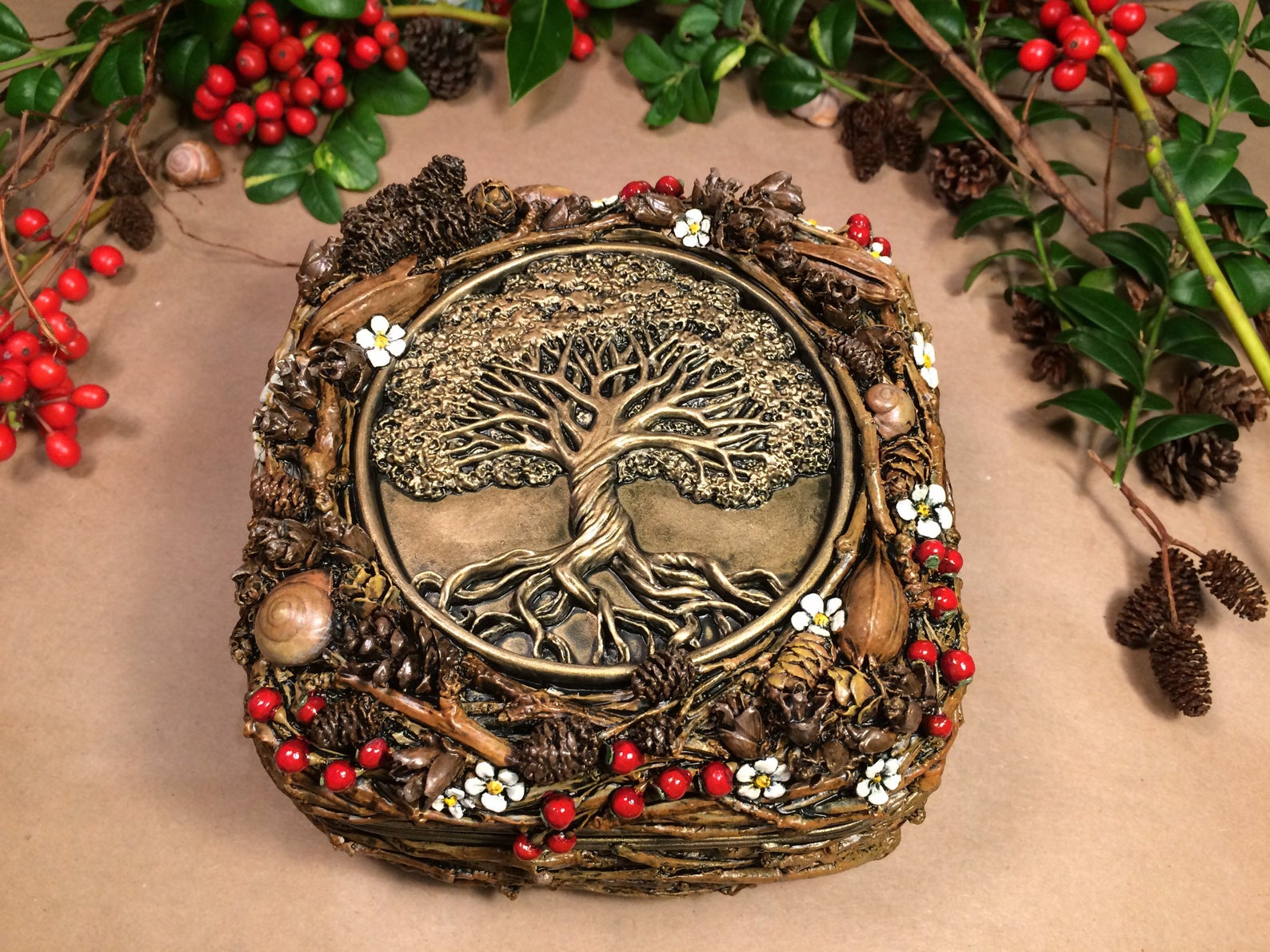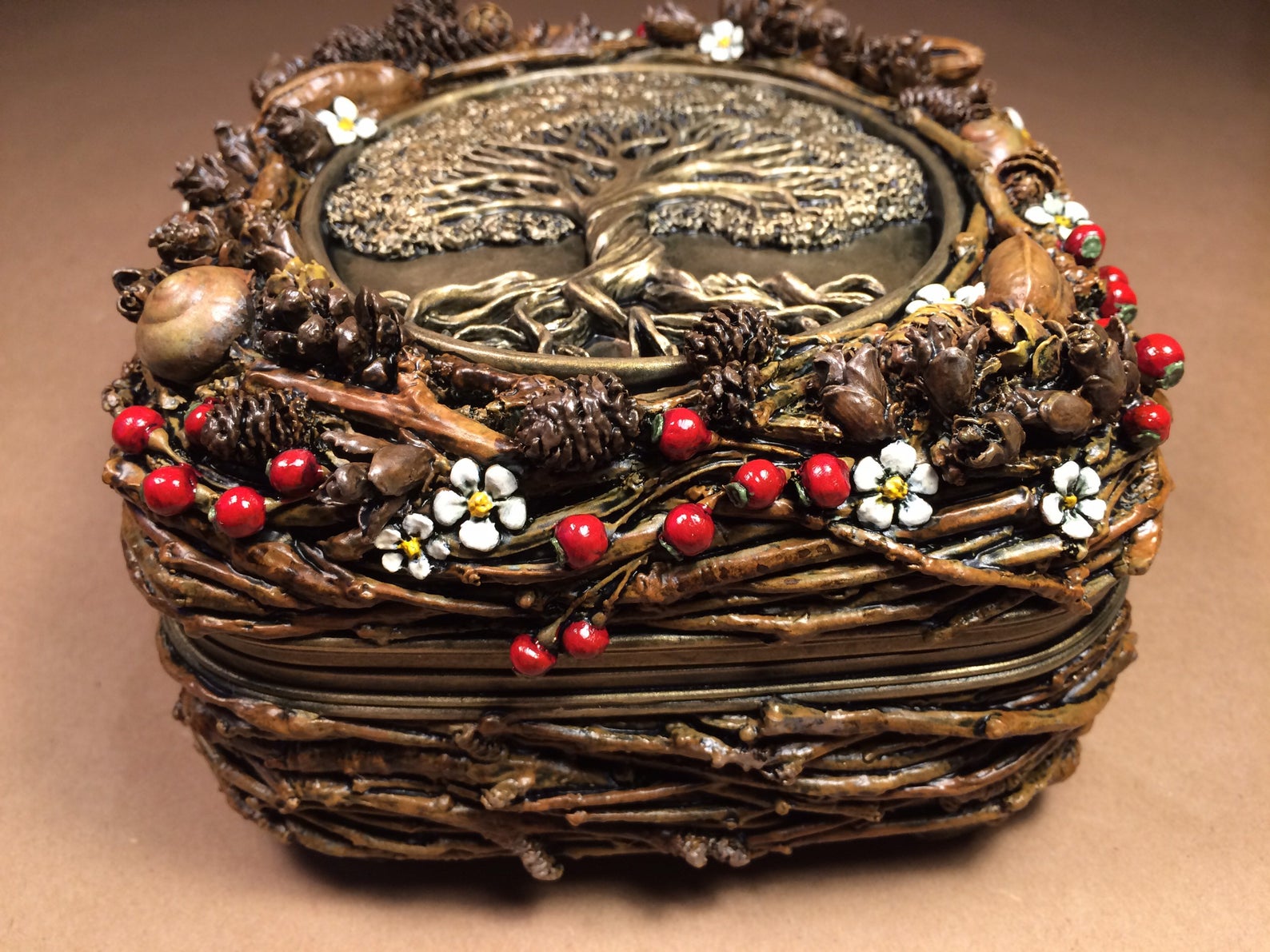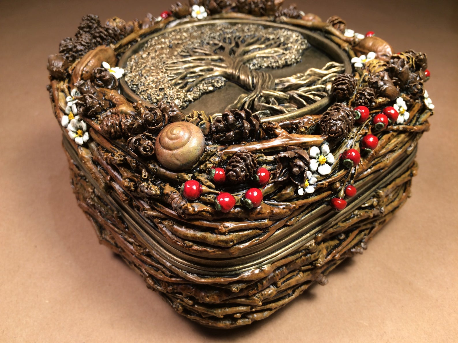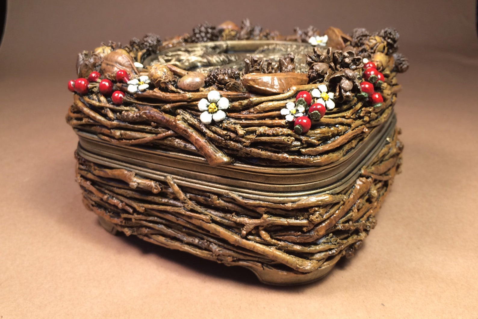 Metallic brass painted embellishments and hand painted details bring out the nature inspired theme.