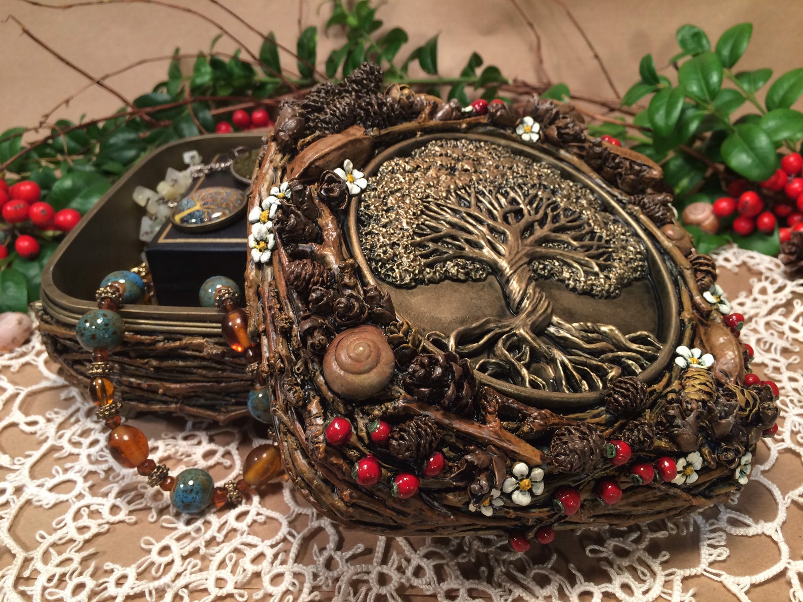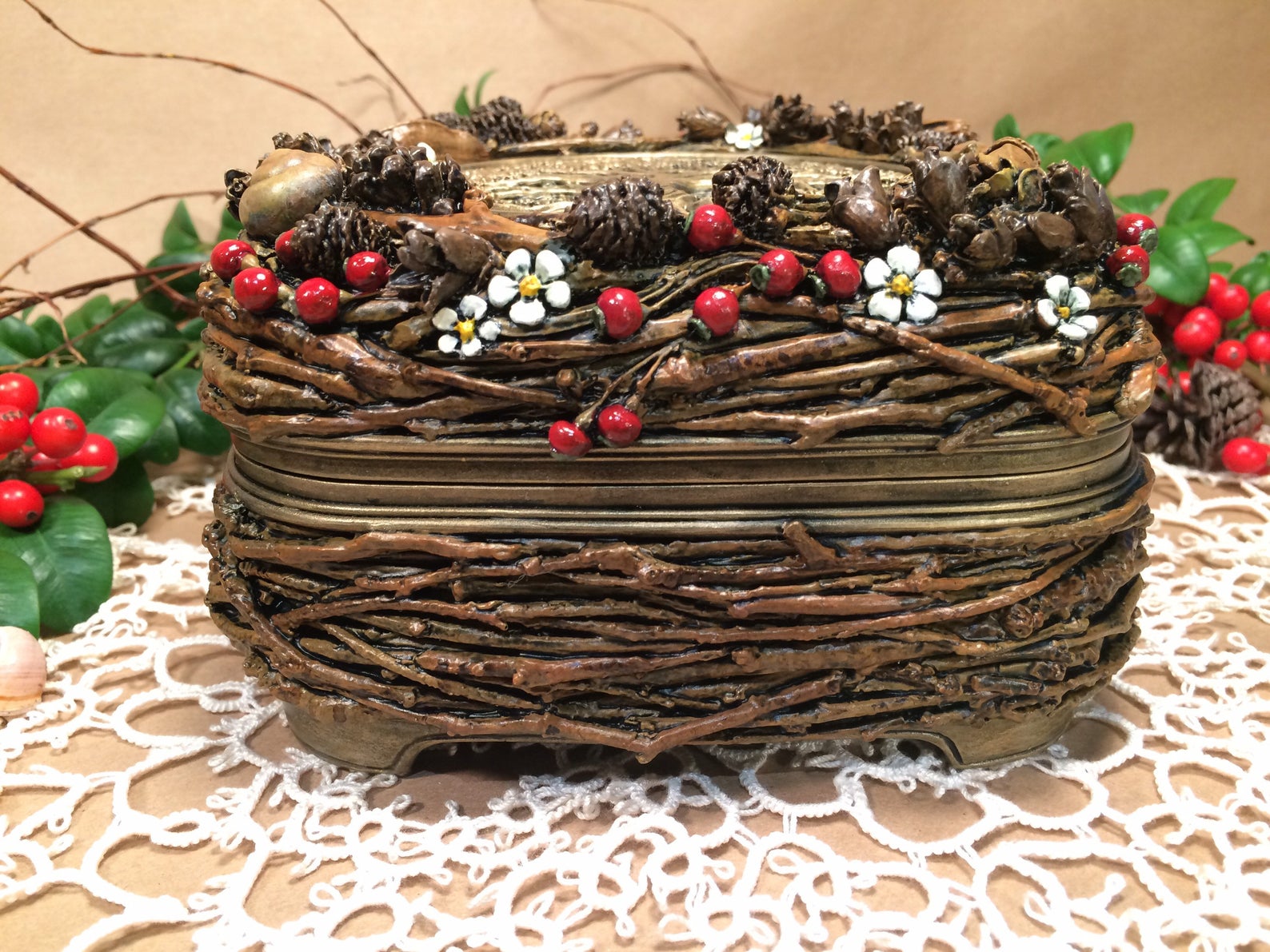 Metallic brass painted embellishments and hand painted details bring out the nature inspired theme.